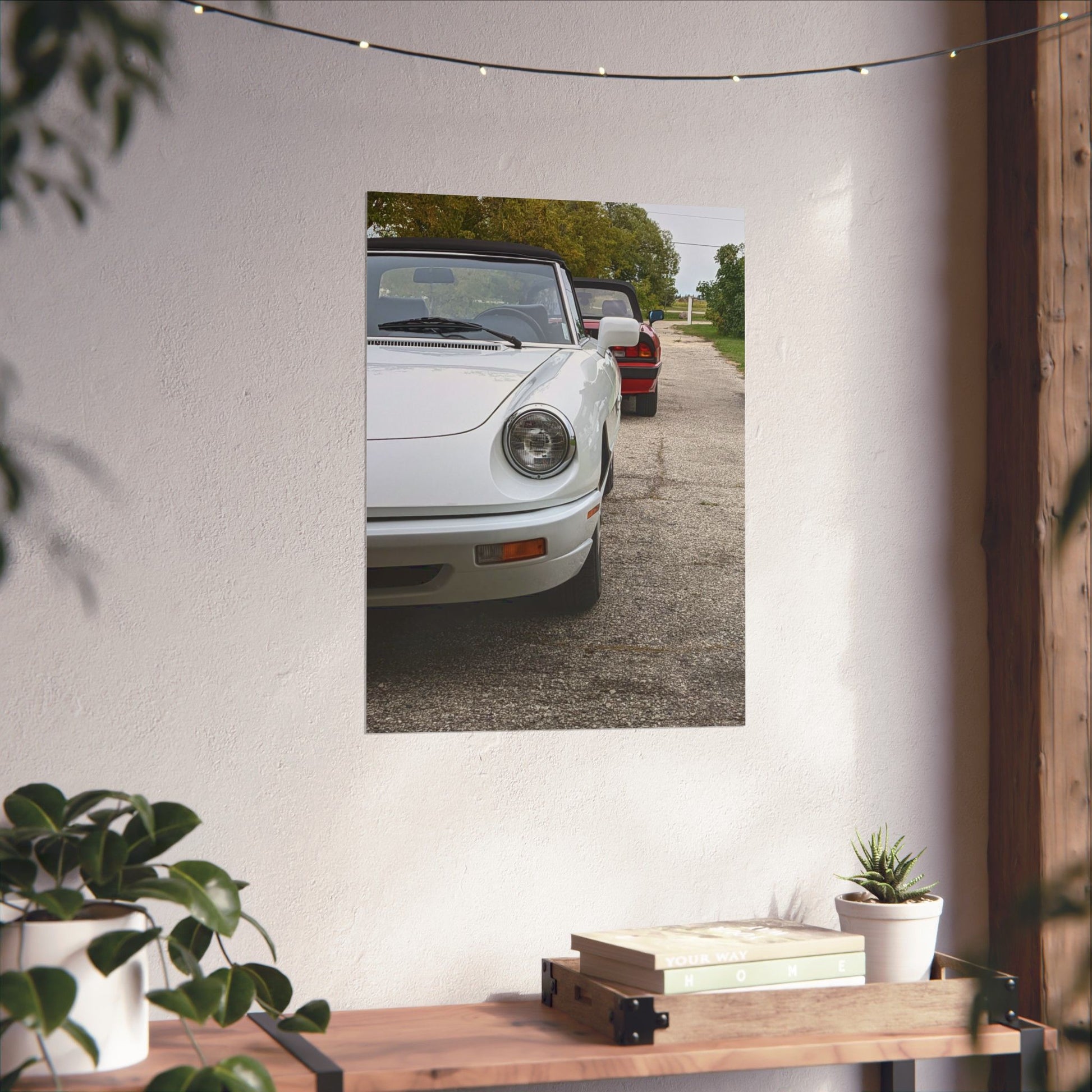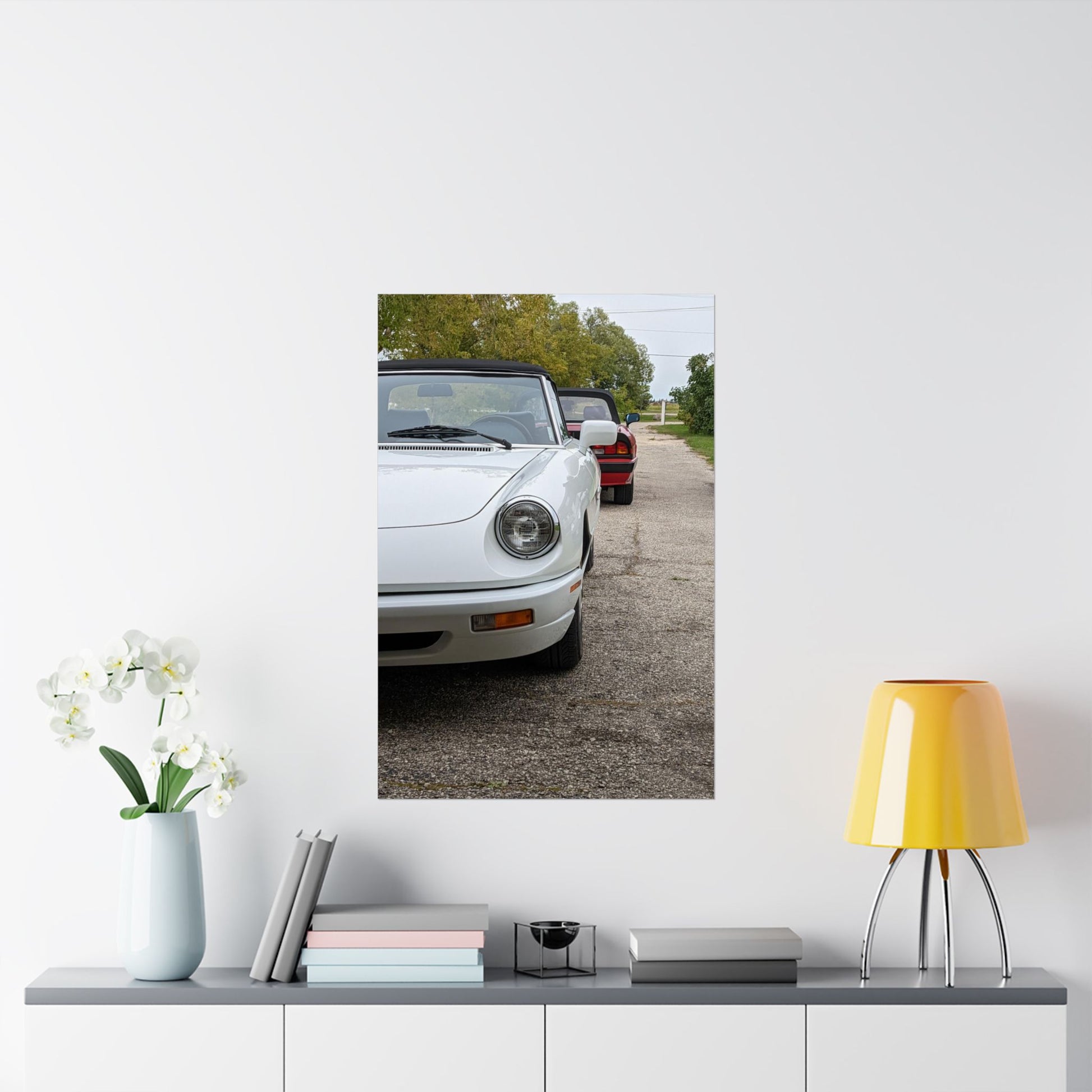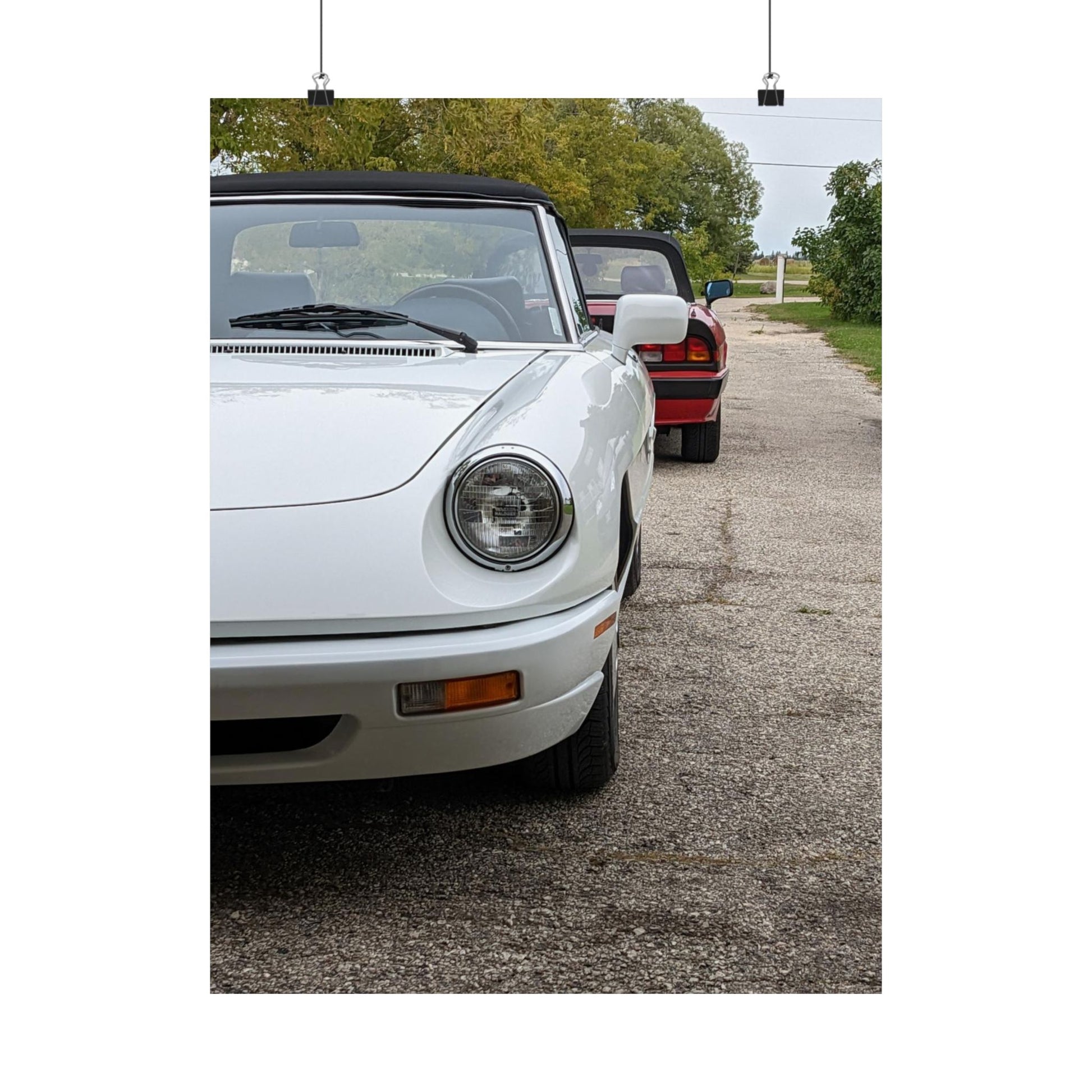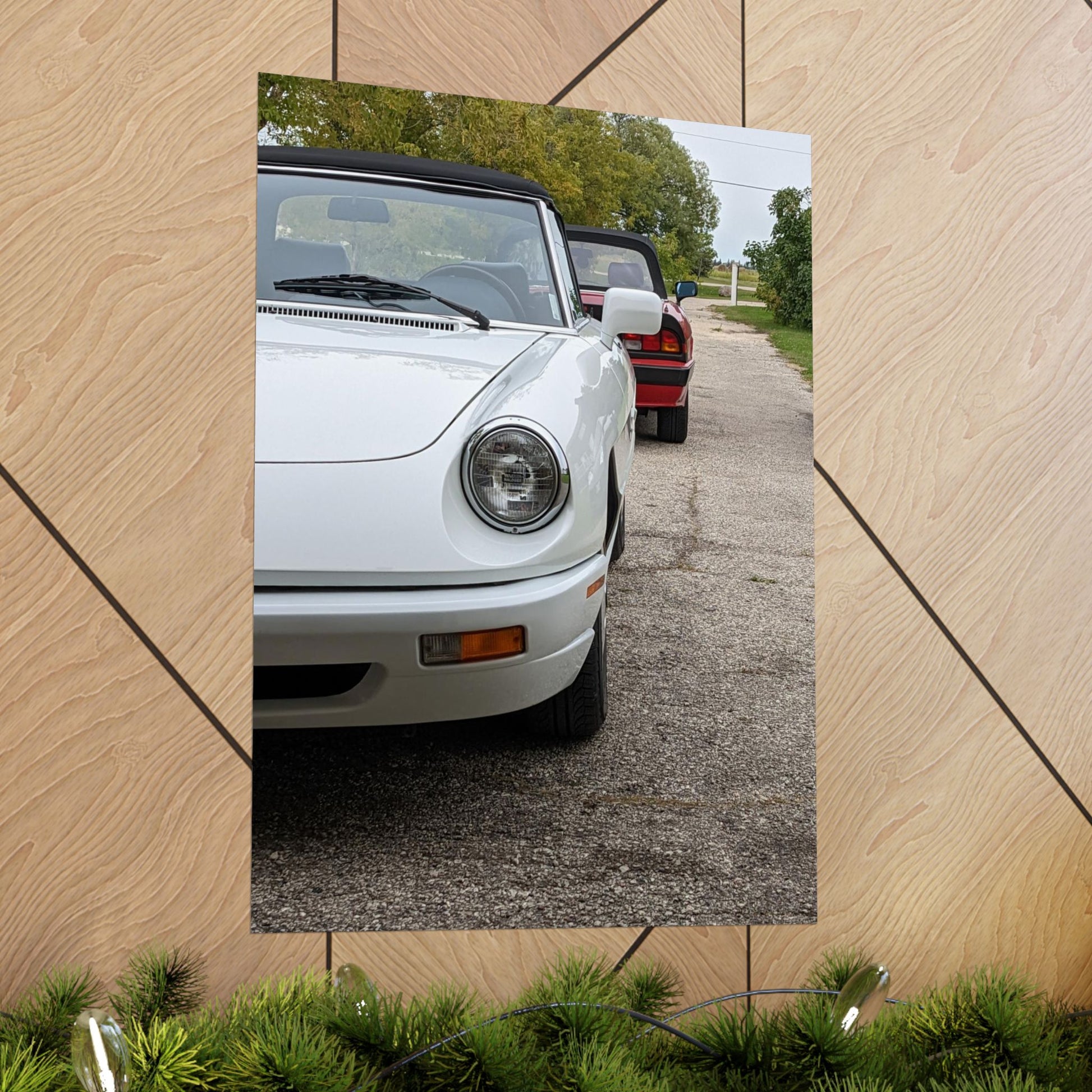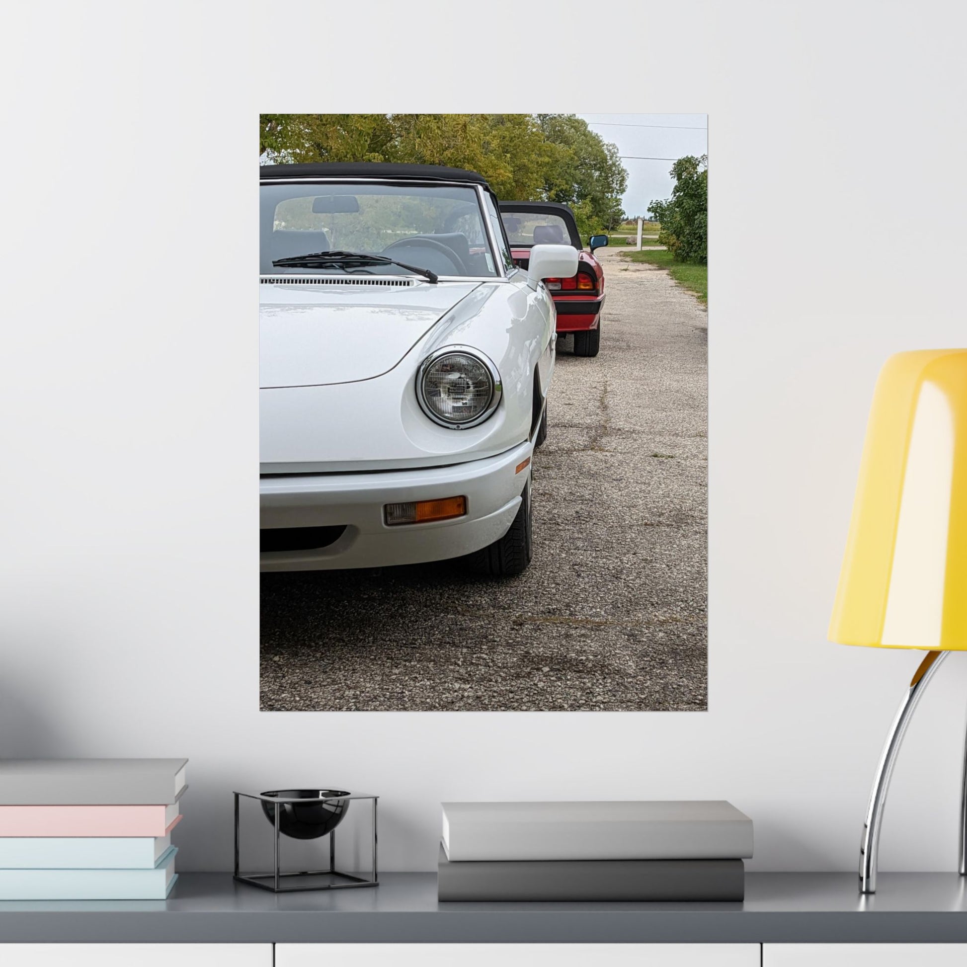 Beautiful poster featuring 2 vintage Alfa Romeo spiders, perfect for automotive enthusiasts and vintage car lovers. Gives a classic and nostalgic vibe, suitable for office or living room decor. Ideal for car lovers, antique car collectors, and automotive enthusiasts. Relevant for car shows, automotive events, Father's Day, and car enthusiasts' birthdays.