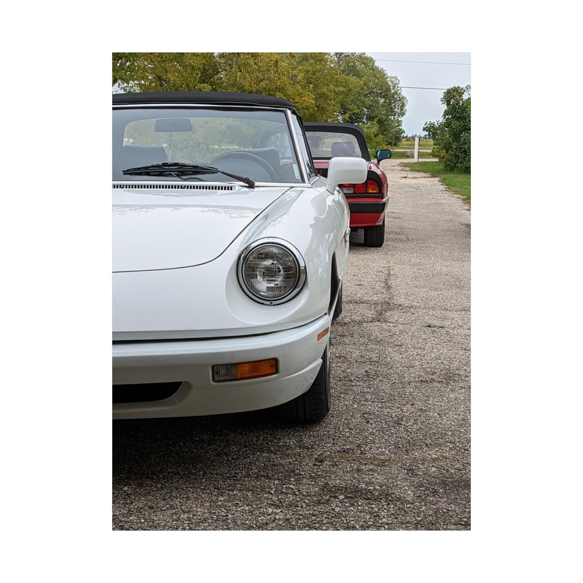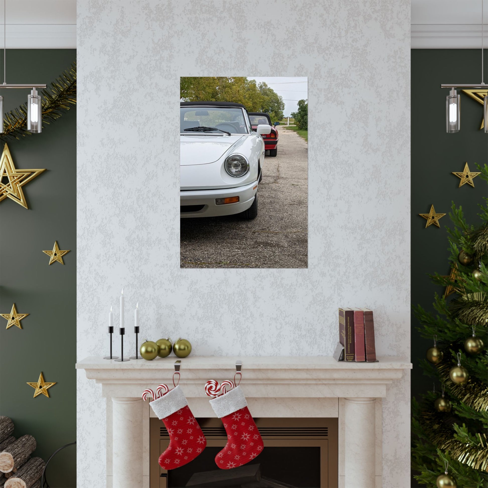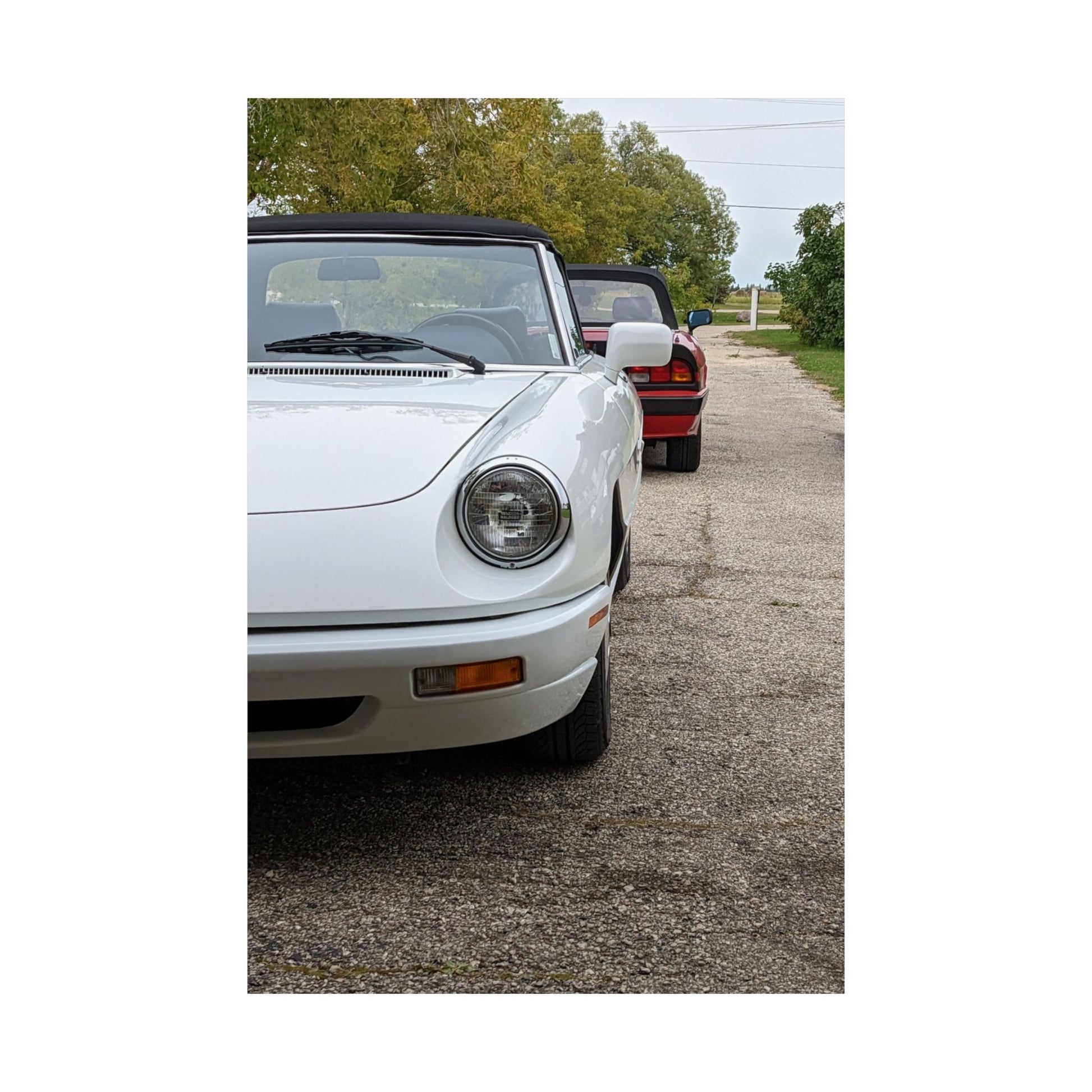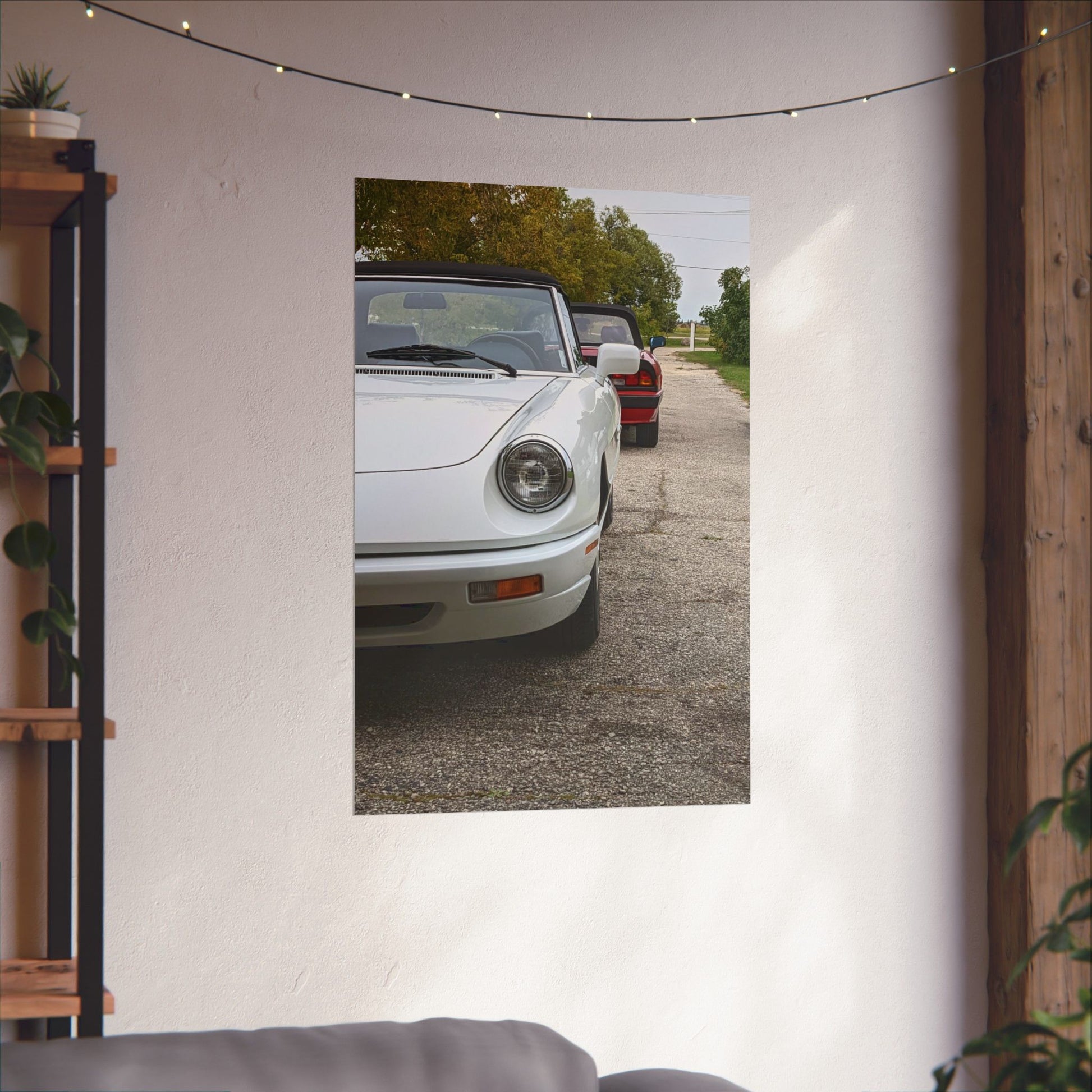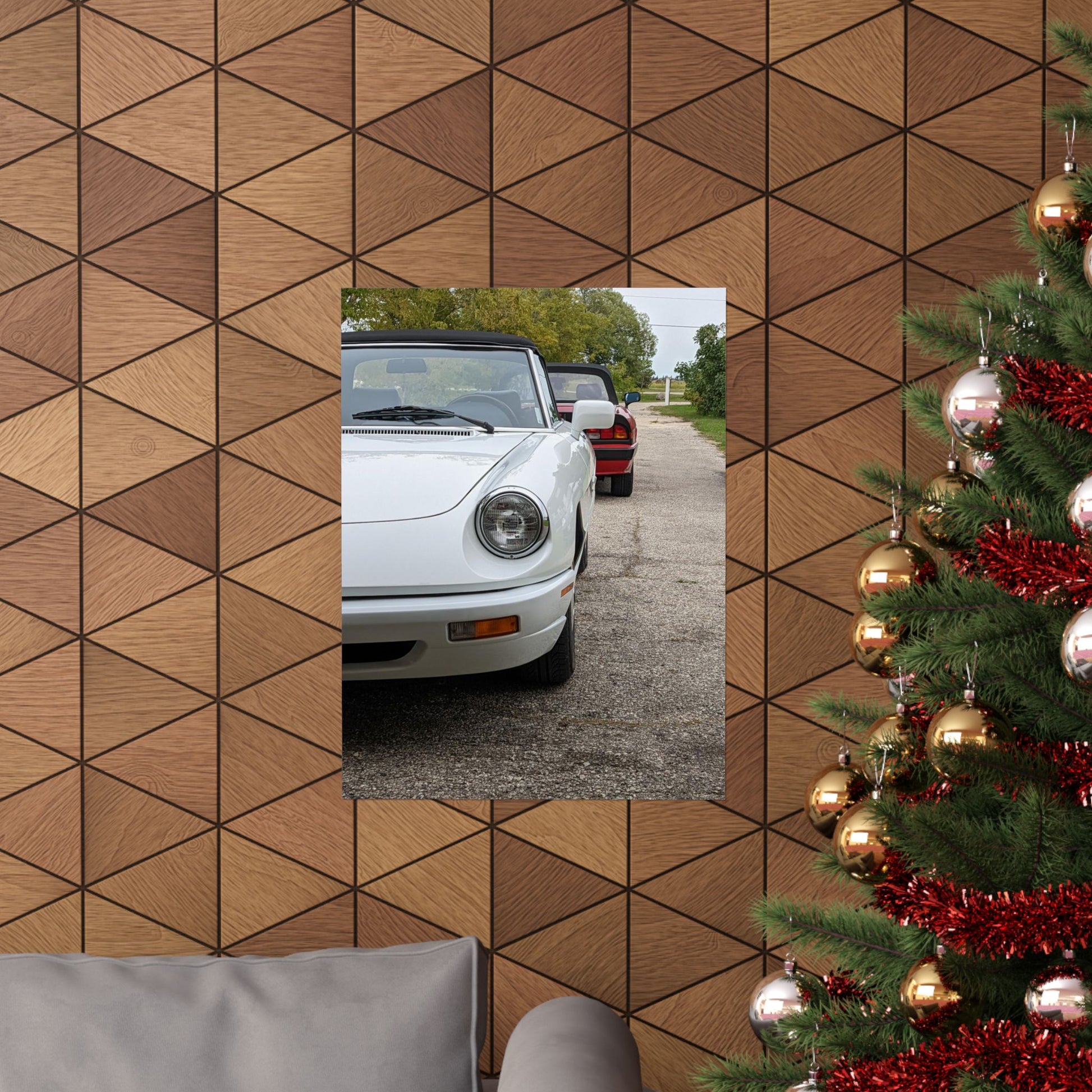 Beautiful poster featuring 2 vintage Alfa Romeo spiders, perfect for automotive enthusiasts and vintage car lovers. Gives a classic and nostalgic vibe, suitable for office or living room decor. Ideal for car lovers, antique car collectors, and automotive enthusiasts. Relevant for car shows, automotive events, Father's Day, and car enthusiasts' birthdays.