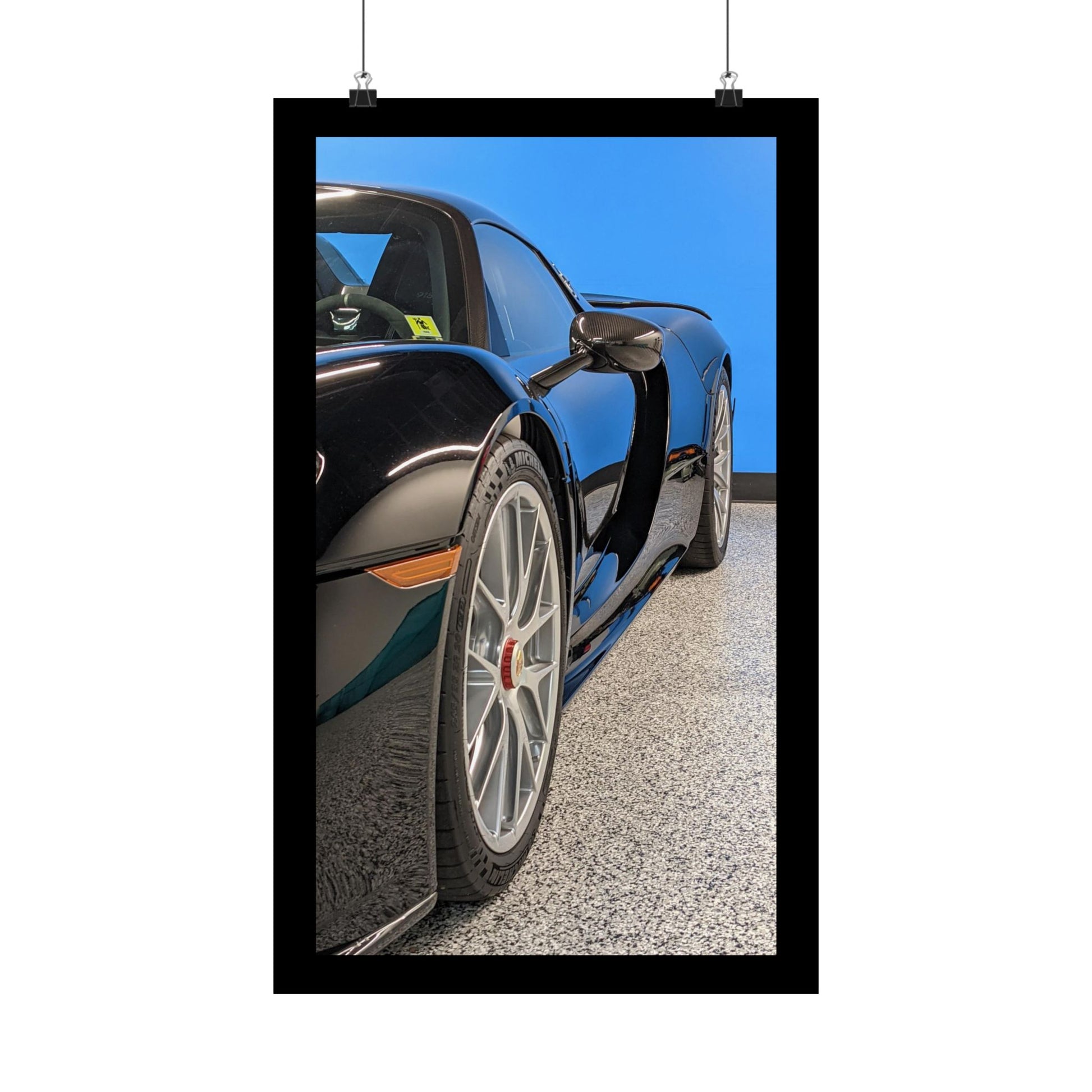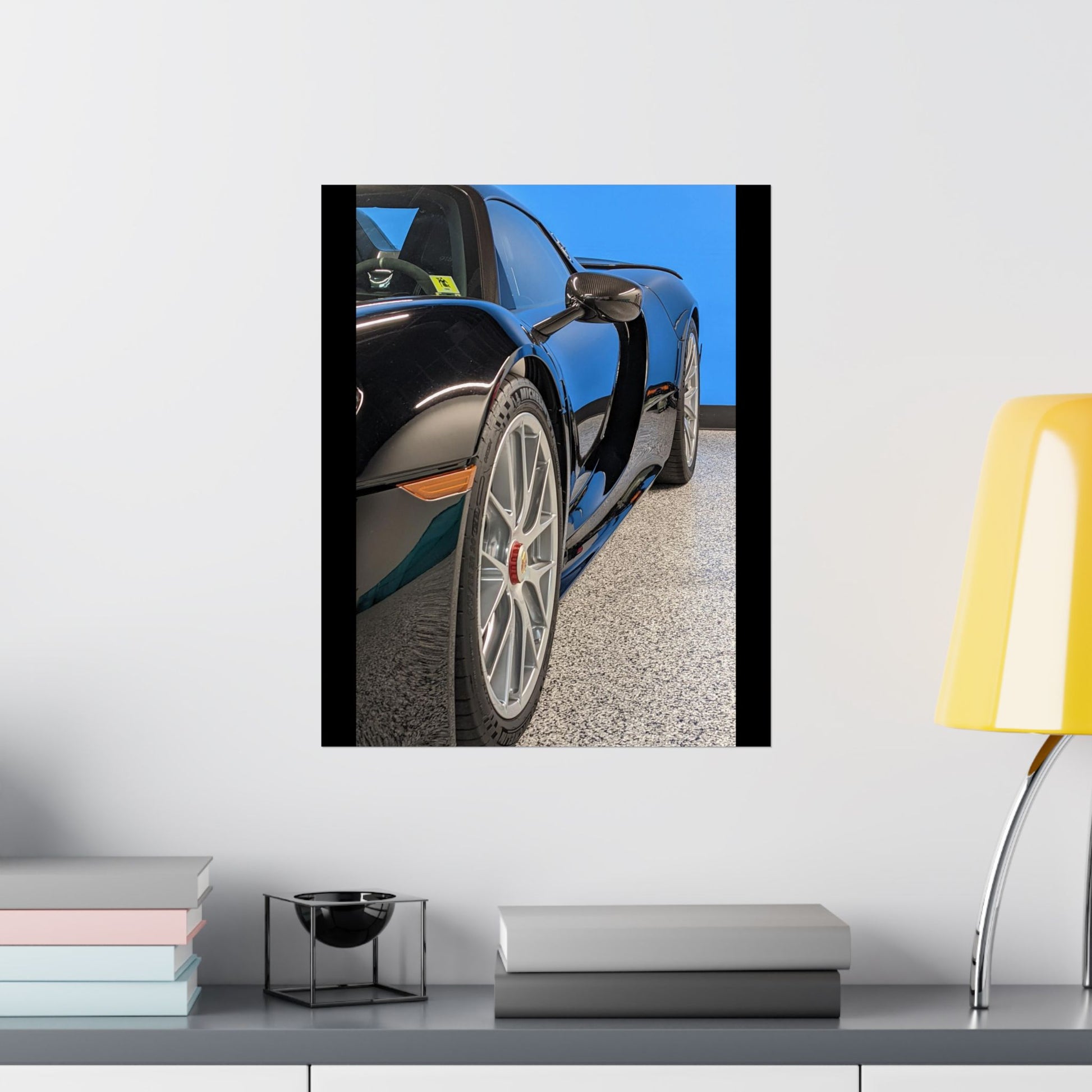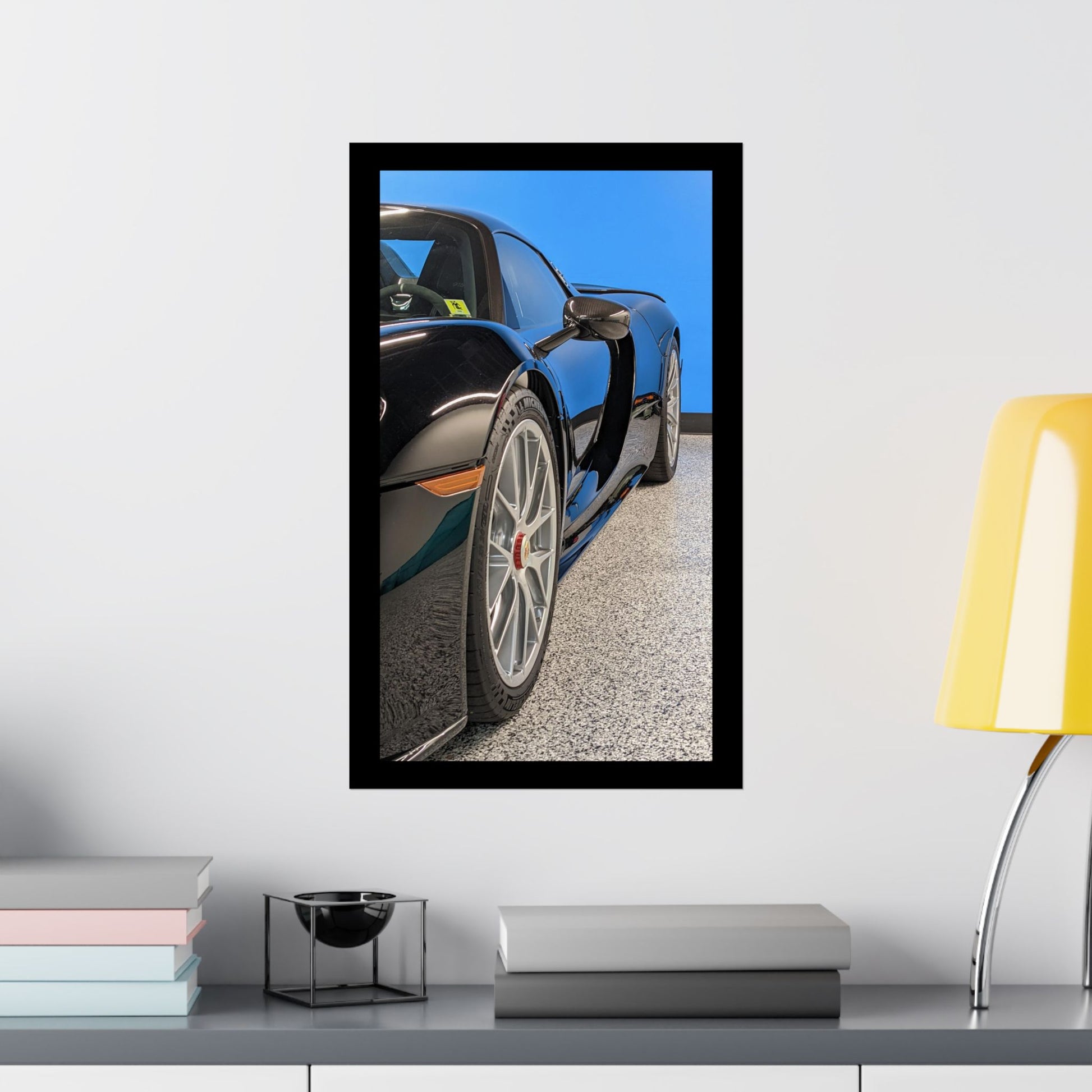 A matte vertical poster featuring a photograph of the Porsche 918 hypercar. This poster gives a sleek and stylish vibe, perfect for car enthusiasts and automotive lovers. Ideal for decorating bedrooms, offices, or man caves. Relevant for birthdays, Father's Day, or as a gift for car enthusiasts.
